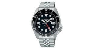 Seiko 5 sports SSK001K1 con un quadrante nero, movimento automatico e funzione di GMT, indicazione di un secondo fuso orario tramite la lancetta rossa a contrasto di colore.